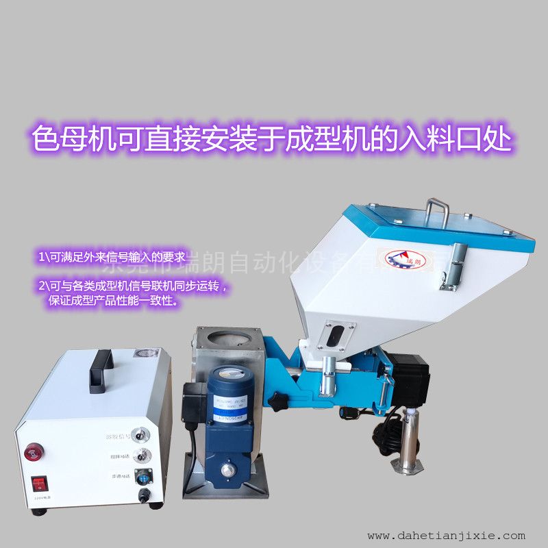 計量式色母機可直接安裝于成型機的入料口處,為了防止控制箱隨成型機螺桿運動而晃動產(chǎn)生相關(guān)配件松動時,建議將其控制箱固定于某支架上。